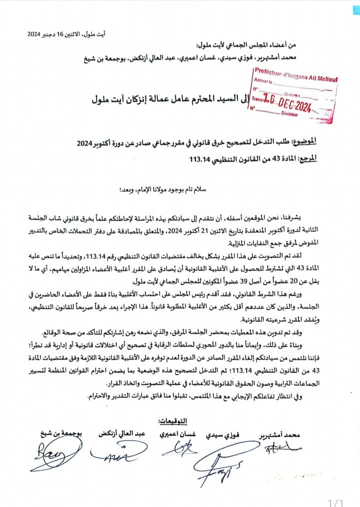 في إطار حرص أعضاء المجلس الجماعي لأيت ملول على ضمان احترام المقتضيات القانونية المؤطرة لأشغال المجالس المنتخبة، تقدم الموقعون على المراسلة المرفقة (محمد أمشتهرير، فوزي سيدي، غسان أعميري، عبد العالي أزنكض، بوجمعة بن شيخ) بمطلب رسمي إلى السيد عامل عمالة إنزكان أيت ملول للتدخل العاجل من أجل تصحيح خرق قانوني جسيم، يتعلق بمقرر المصادقة على دفتر التحملات الخاص بالتدبير المفوض لمرفق جمع النفايات المنزلية؛ وهو أحد مقررات الدورة العادية لشهر أكتوبر 2024.