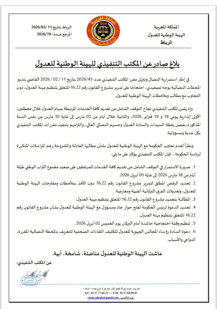 وشددت الهيئة الوطنية في ختام بلاغها على أن إصلاح مهنة العدالة يقتضي بالضرورة ملاءمة مقتضيات القانون الجديد مع روح دستور 2011 وتوصيات ميثاق إصلاح منظومة العدالة، مؤكدة أن كرامة المنتسبين للمهنة وحقوقهم المشروعة ليست محل مساومة، وأن الاستمرار في نهج “الآذان الصماء” لن يؤدي إلا إلى مزيد من التوتر في الساحة المهنية، مما قد يعطل مصالح المواطنين الحيوية المرتبطة بالعقود والتوثيق لفترة طويلة.
