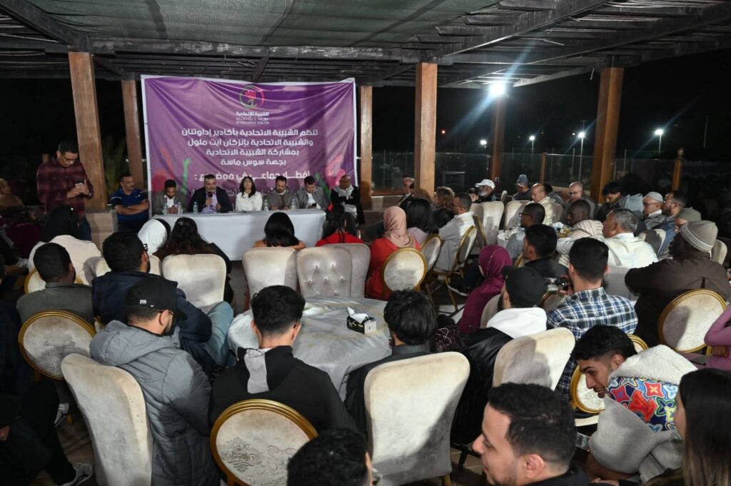 في أجواء رمضانية مفعمة بروح الحوار والنقاش، نظمت الشبيبة الاتحادية بأكادير إداوتنان والشبيبة الاتحادية بإنزكان آيت ملول، بمشاركة الشبيبة الاتحادية بجهة سوس ماسة، لقاء تواصليا تخلله إفطار جماعي ومائدة نقاش حول موضوع: “الشباب في قلب رهانات التنمية بجهة سوس ماسة” وذلك مساء يوم الأحد 15 مارس 2026 بالنادي الغابوي بمدينة أكادير.