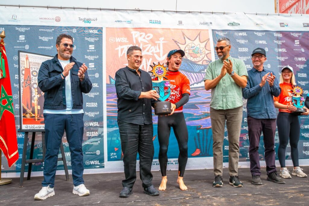 أشرف السيد سعيد أمزازي، والي جهة سوس ماسة، عامل عمالة أكادير إداوتنان، يومه الأحد 29 مارس 2026، رفقة السيد كريم أشنكلي، رئيس مجلس جهة سوس ماسة، على حفل تتويج الفائزين في منافسة “Pro Taghazout Bay QS 4000”، التي تُعد واحدة من أبرز المحطات الدولية في رياضة ركوب الأمواج، ومحطة رئيسية ضمن جولات التصفيات المؤهلة لعصبة ركوب الأمواج العالمية (World Surf League).